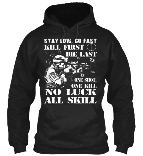 -"Stay Low, Go Fast, Kill First, Die Last, One Shot One Kill, No Luck, All Skill" - Patriot Apparel Company logo on the sleeve. Where is quote "Stay low, go fast, kill first, die last, one shot, one kill, no luck, pure skill" from?. Stay low, Go Fast Kill First, Die Last One Shot , One Kill No Luck, All Skill.